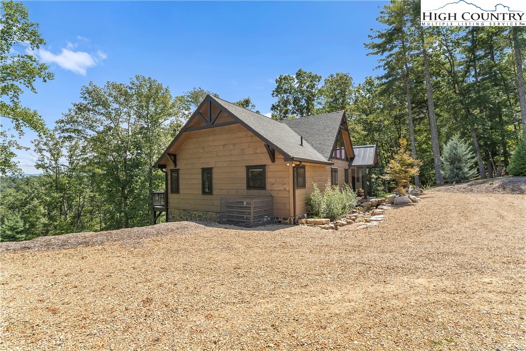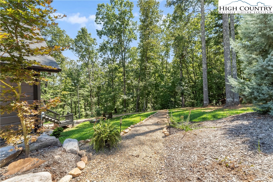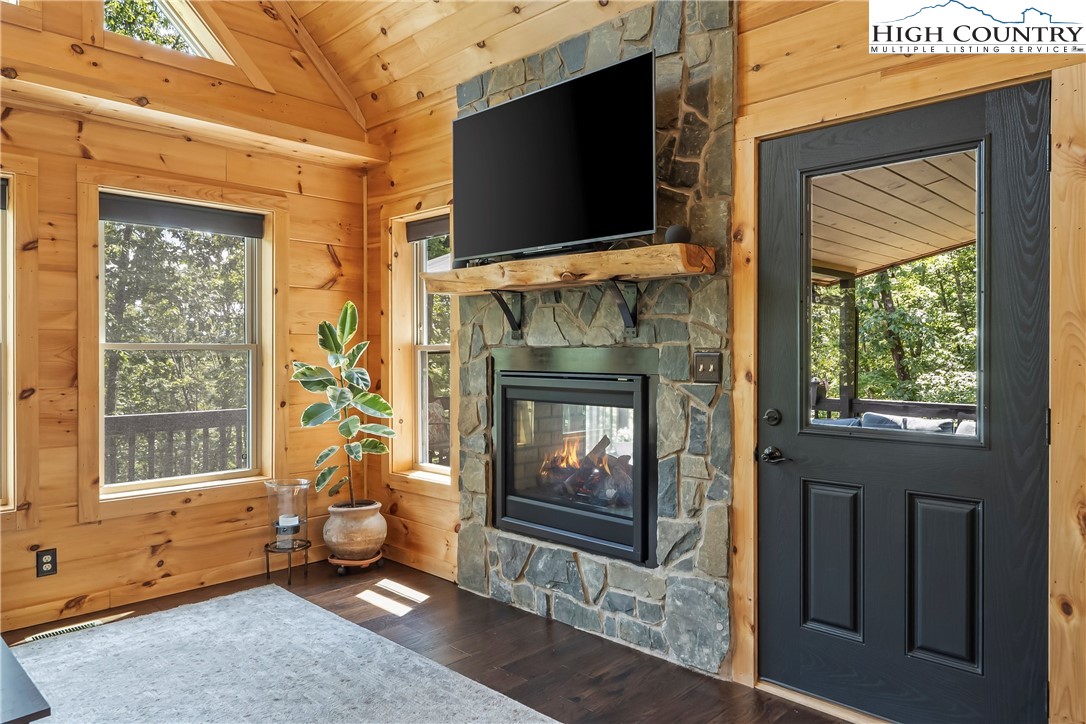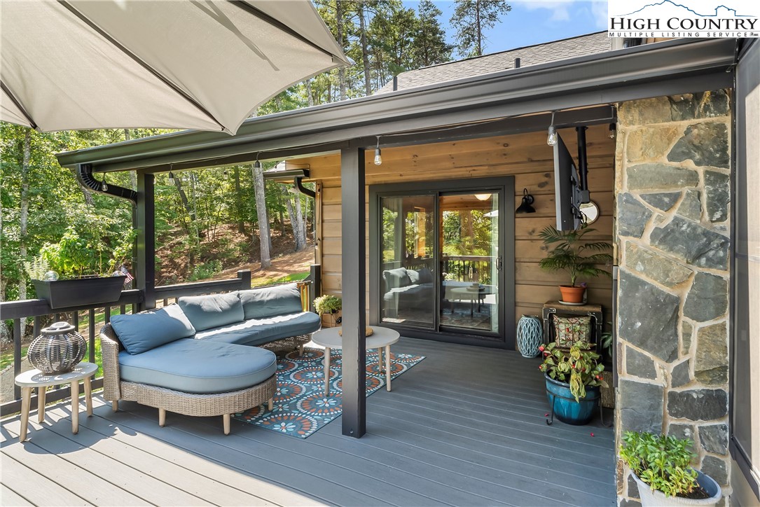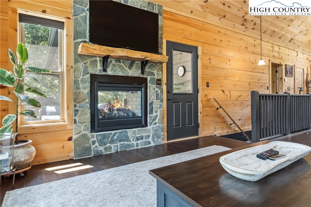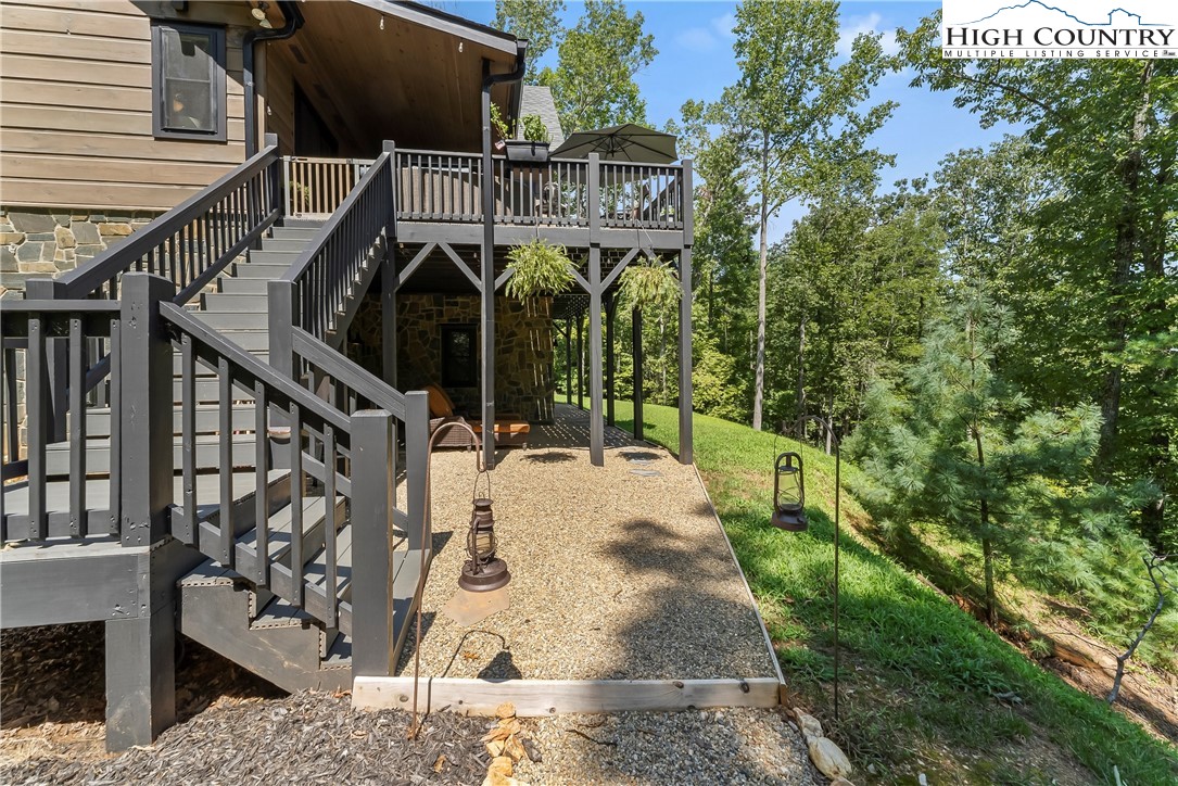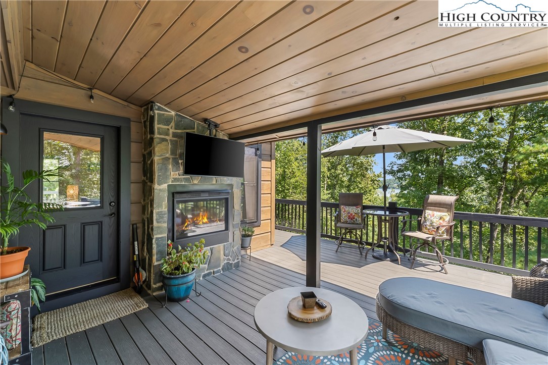 Nestled on 1.41 acres between 2 conservation areas, this stunning Blue Ridge log home offers a tranquil mountain escape with breathtaking lake views. Enter the home across the rock bridge surrounded by boulders and a wet weather rock bed. The main level welcomes you with a spacious, open great room that shares a cozy two-sided gas fireplace with the adjacent covered porch and has lake views surrounded by the trees. The primary suite is conveniently located on the main floor and has private balcony providing lake views and a peaceful sanctuary. An additional bedroom with ensuite full bath are also on this level, perfect for guests. Guest bath and laundry on main level as well. The lower level is designed for both relaxation and entertaining. It features two more bedrooms, a full hall bathroom and a dedicated office space for remote work. The large great room on this floor is an entertainment hub, complete with a wet bar for serving drinks to family and friends. Tin ceiling, stained concrete floor and wine nook under stairs. Retractable glass sliding doors let you enjoy the lake views. The deeded community boat slip is just a short walk or golf cart ride away for easy access to Lake James. As a resident, you'll also enjoy membership to Camp Lake James, offering an array of amenities and social events. This home is more than a residence; it's a lifestyle, blending rustic charm with modern comfort & lake views with endless opportunities for recreation on one of North Carolina's most beautiful lakes.
