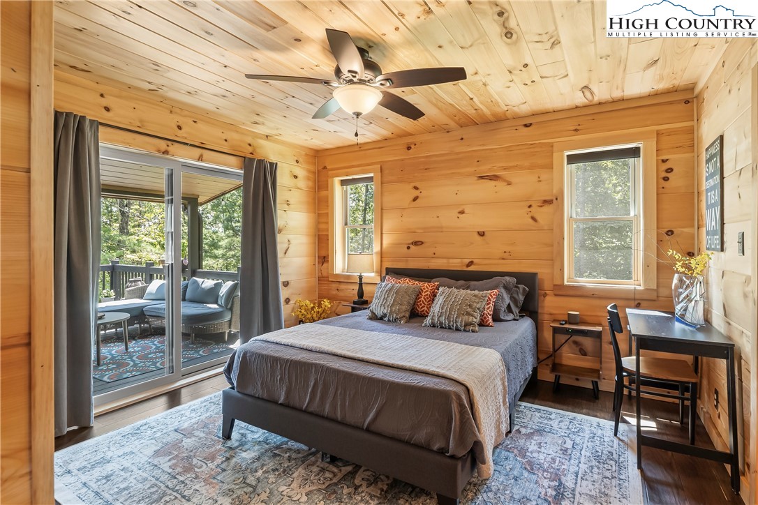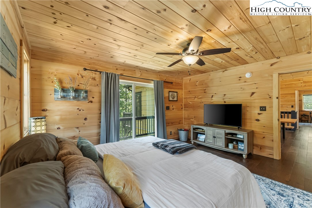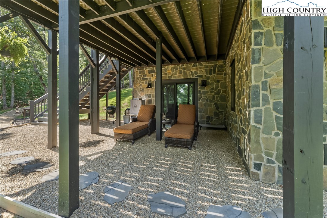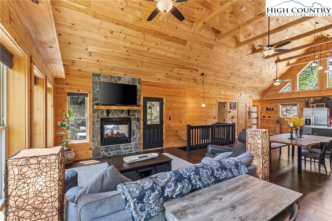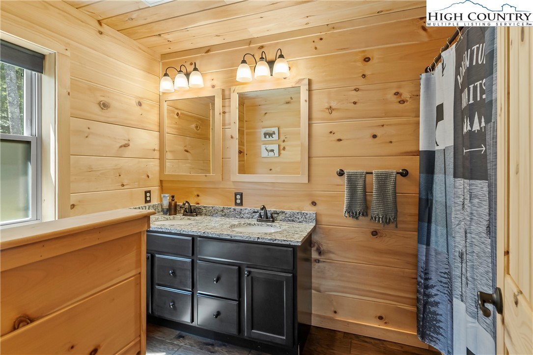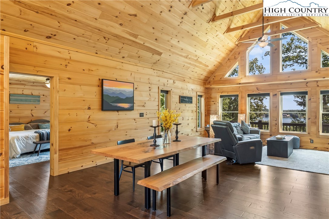 Nestled on 1.41 acres between 2 conservation areas, this stunning Blue Ridge log home offers a tranquil mountain escape with breathtaking lake views. Enter the home across the rock bridge surrounded by boulders and a wet weather rock bed. The main level welcomes you with a spacious, open great room that shares a cozy two-sided gas fireplace with the adjacent covered porch and has lake views surrounded by the trees. The primary suite is conveniently located on the main floor and has private balcony providing lake views and a peaceful sanctuary. An additional bedroom with ensuite full bath are also on this level, perfect for guests. Guest bath and laundry on main level as well. The lower level is designed for both relaxation and entertaining. It features two more bedrooms, a full hall bathroom and a dedicated office space for remote work. The large great room on this floor is an entertainment hub, complete with a wet bar for serving drinks to family and friends. Tin ceiling, stained concrete floor and wine nook under stairs. Retractable glass sliding doors let you enjoy the lake views. The deeded community boat slip is just a short walk or golf cart ride away for easy access to Lake James. As a resident, you'll also enjoy membership to Camp Lake James, offering an array of amenities and social events. This home is more than a residence; it's a lifestyle, blending rustic charm with modern comfort & lake views with endless opportunities for recreation on one of North Carolina's most beautiful lakes.