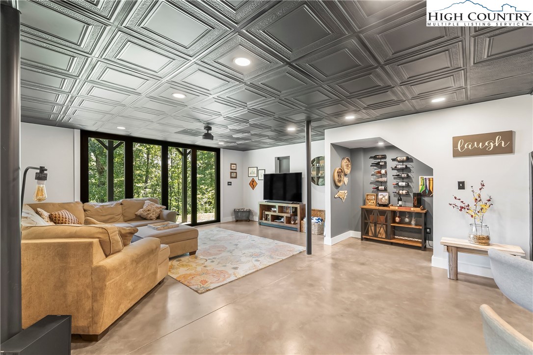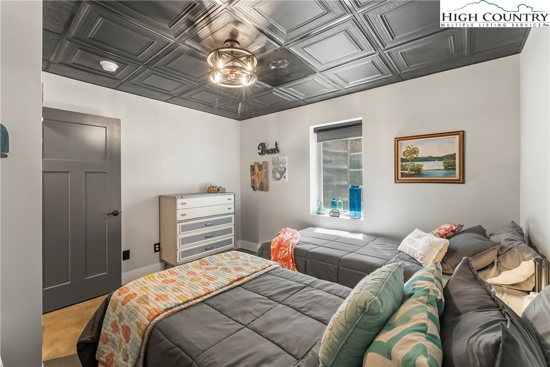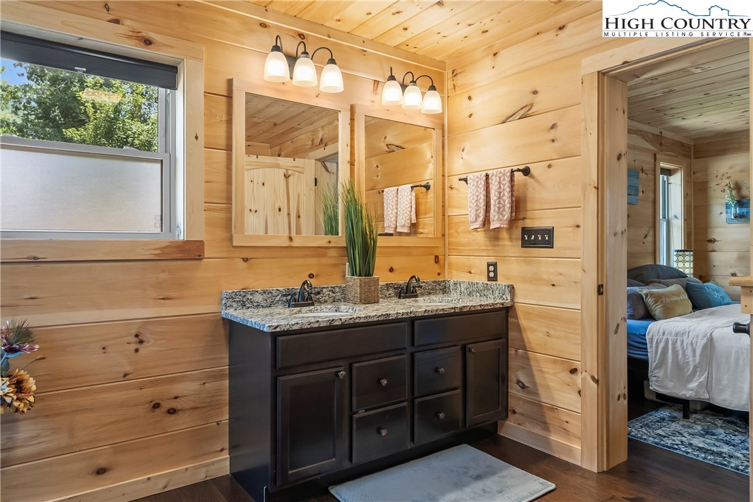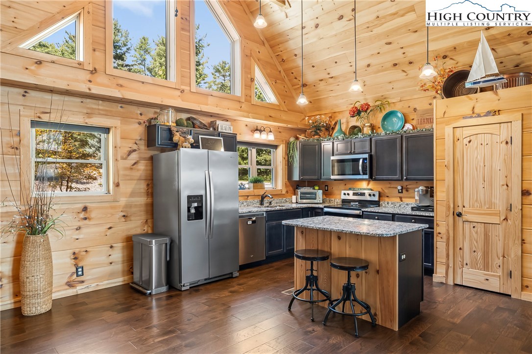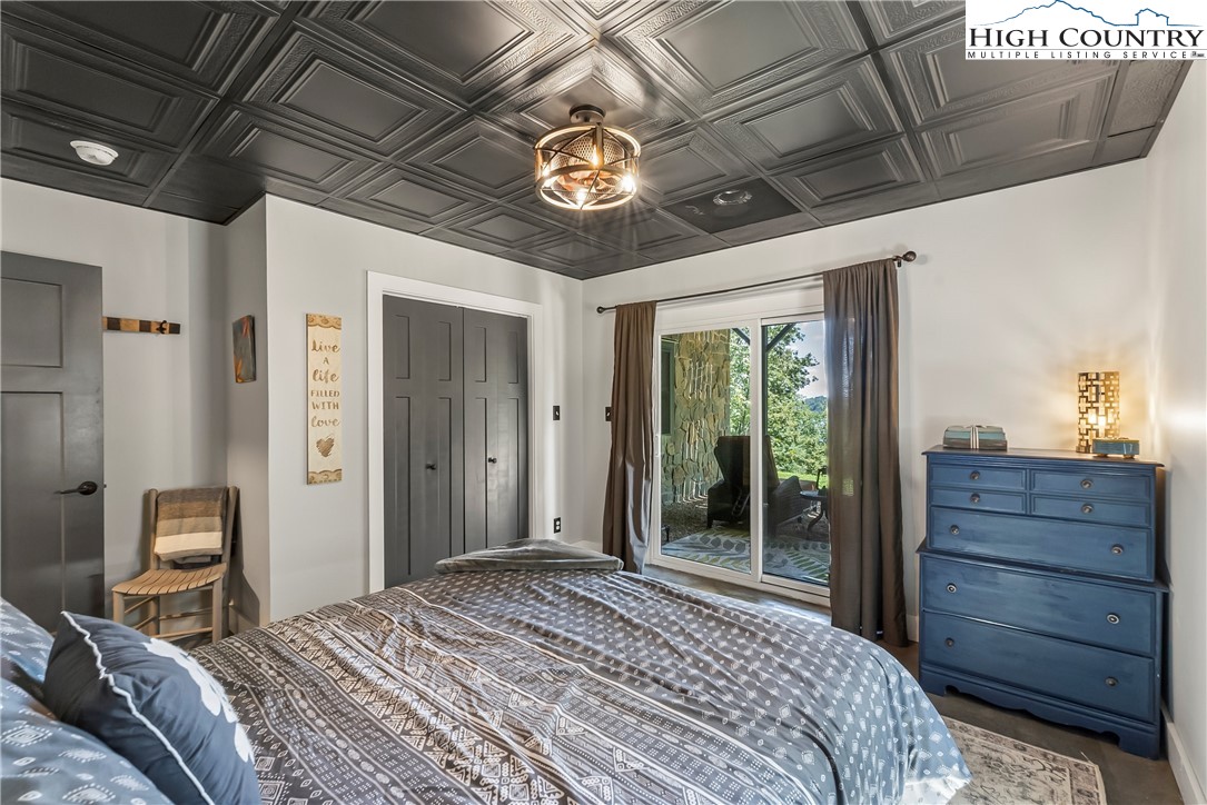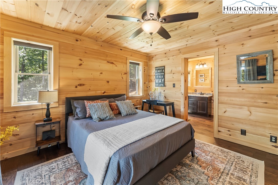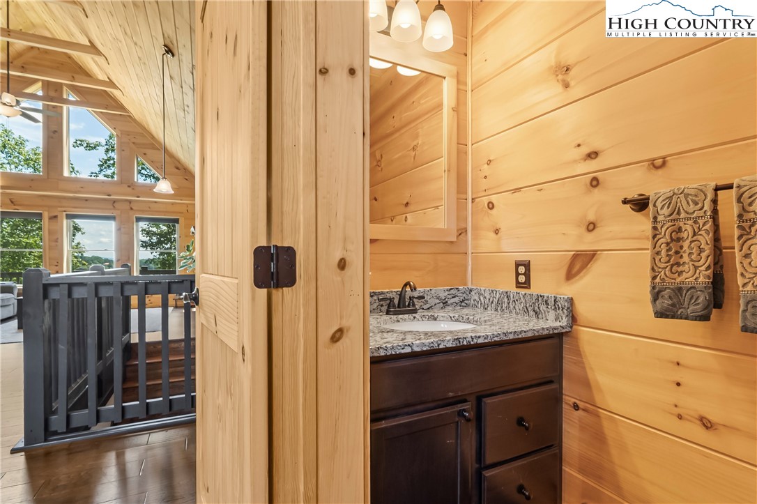 Nestled on 1.41 acres between 2 conservation areas, this stunning Blue Ridge log home offers a tranquil mountain escape with breathtaking lake views. Enter the home across the rock bridge surrounded by boulders and a wet weather rock bed. The main level welcomes you with a spacious, open great room that shares a cozy two-sided gas fireplace with the adjacent covered porch and has lake views surrounded by the trees. The primary suite is conveniently located on the main floor and has private balcony providing lake views and a peaceful sanctuary. An additional bedroom with ensuite full bath are also on this level, perfect for guests. Guest bath and laundry on main level as well. The lower level is designed for both relaxation and entertaining. It features two more bedrooms, a full hall bathroom and a dedicated office space for remote work. The large great room on this floor is an entertainment hub, complete with a wet bar for serving drinks to family and friends. Tin ceiling, stained concrete floor and wine nook under stairs. Retractable glass sliding doors let you enjoy the lake views. The deeded community boat slip is just a short walk or golf cart ride away for easy access to Lake James. As a resident, you'll also enjoy membership to Camp Lake James, offering an array of amenities and social events. This home is more than a residence; it's a lifestyle, blending rustic charm with modern comfort & lake views with endless opportunities for recreation on one of North Carolina's most beautiful lakes.