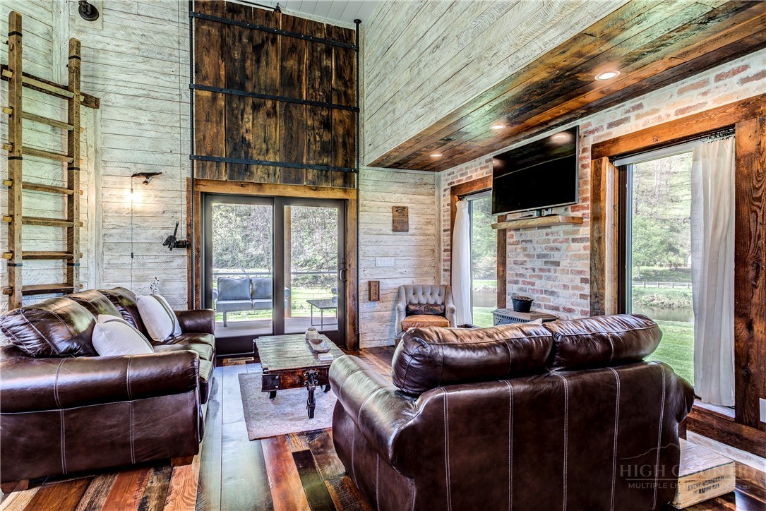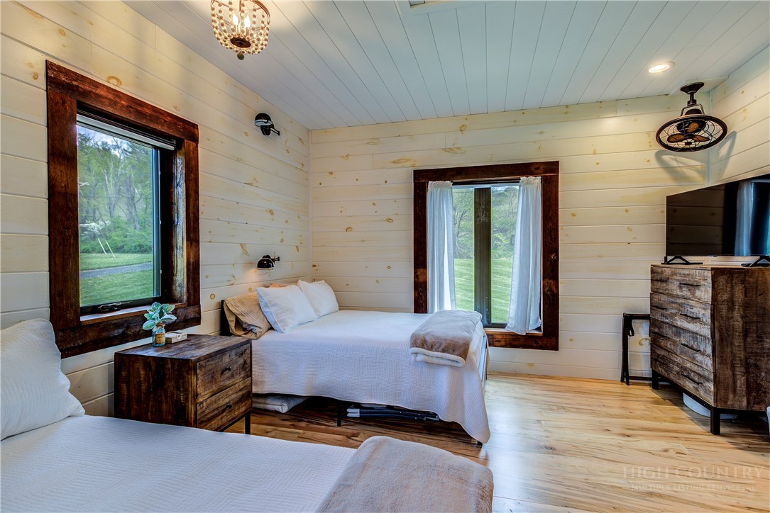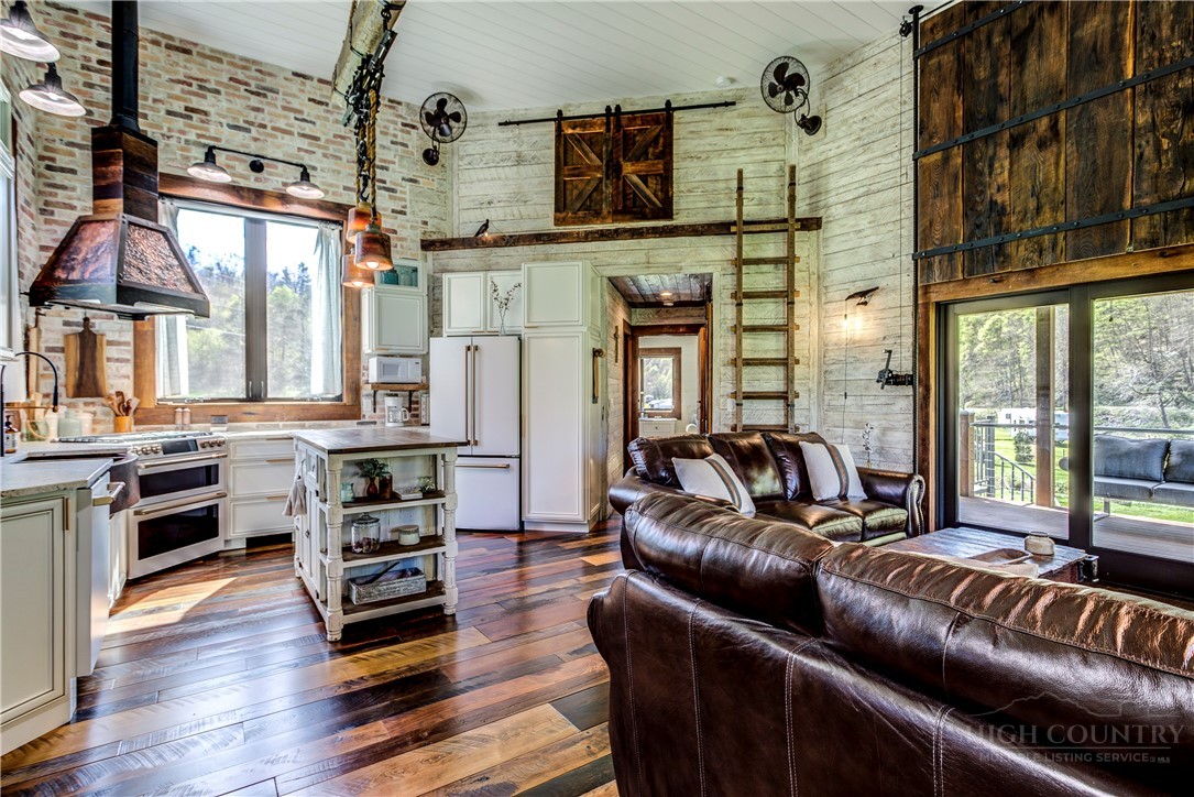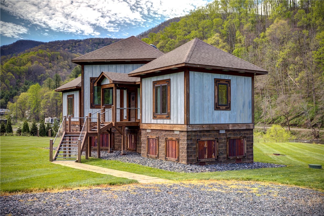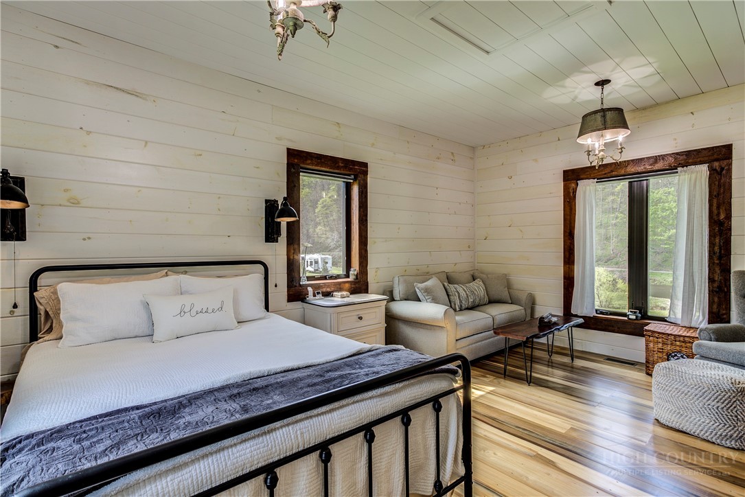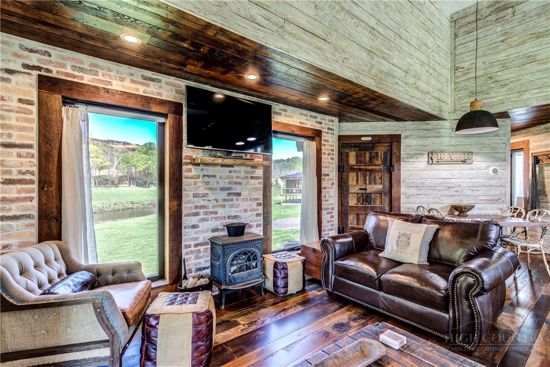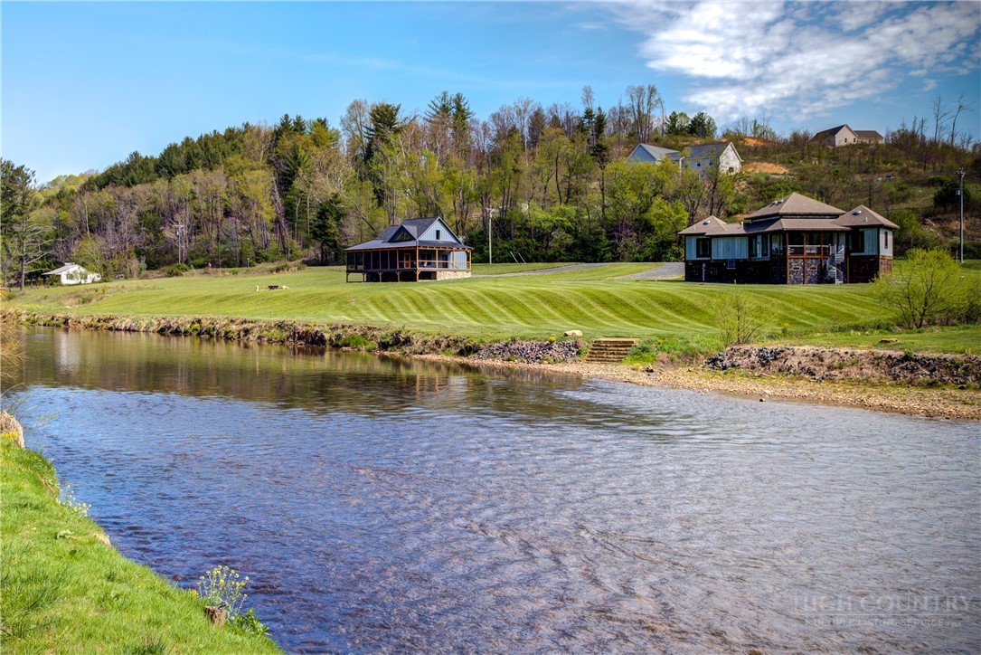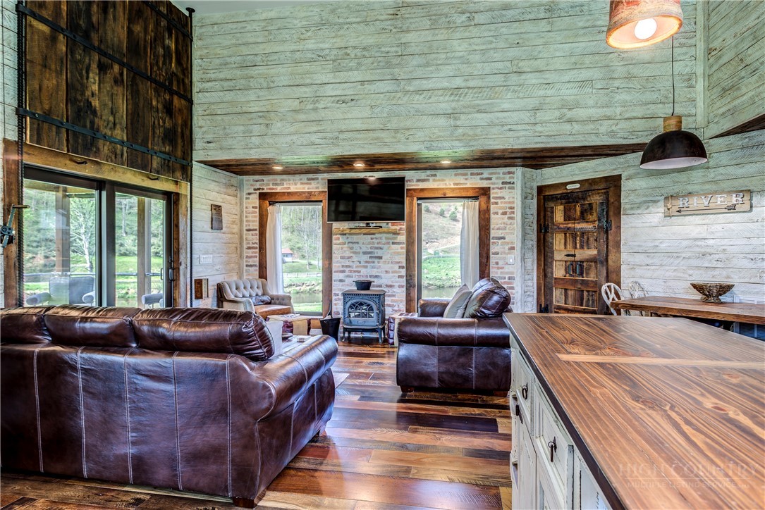 Unique, custom, thoughtfully designed and beautiful are just a few words to describe this riverfront home! Built in 2022, this home offers everything you could need. Step into your one-of-a-kind space where craftsmanship, history, and modern comfort all come together to offer effortless river living. The living room and kitchen feature soaring 14-foot ceilings, bedrooms offer 9-foot ceilings, and bathrooms and hallways have 8-foot ceilings for a cozy feel. Character shines throughout the entire home. Reclaimed Oak from an 1800s barn at Latta Place Plantation in Huntersville, NC enhances the living room walls, hallways, ceilings, fireplace surround, bathroom ceilings, and all window and door trim. The primary bedroom features Rainbow Poplar flooring and closet walls, while the second bedroom showcases Ambrosia Maple from a mill in Mountain City, TN. Living areas include handcrafted flooring of Oak, Hickory, Maple, Poplar, and Pine from Johnson City, TN, hand-stained in five tones that go with each species. Custom details include a protective door above the sliding glass door with hand crank, auto-lock, and brake. Interior doors, bathroom cabinetry, and towel storage were built by local craftsman Maurice Jenkins. Live-edge black walnut highlights bathroom countertops and shelving. The kitchen features custom cabinetry, Café appliances by GE, a custom island light made from an antique hay trolley, and a stove hood crafted from reclaimed wood and hand-hammered copper. Enjoy a Jotul 3 propane fireplace, tankless Rinnai water heater, soaker tub with shower, and tallboy toilets with UK-imported pull chains. The home is fully furnished with leather seating, a queen bed, pullout sofa, two double beds, and an LG washer/dryer tower. Exterior features include an electric/propane HVAC system with Nest control, a solid mahogany front door, Trex porches, aged galvanized metal porch ceilings, distressed galvanized siding and ample storage space. The property also offers a custom bridge over the creek, stone river steps, whole-house water filtration, a camper pad with 30-amp hookup and septic, and wiring for exterior security cameras. Enjoy relaxing on your covered porch or head down to the river and set your umbrellas in the designated spots on your flagstone patio. A rare blend of rustic heritage, artisan craftsmanship, and modern comfort—this meticulously designed retreat is truly special. Altogether, these features make this home a rare opportunity to own a thoughtfully crafted retreat where every detail has been carefully considered. Schedule your showing today!