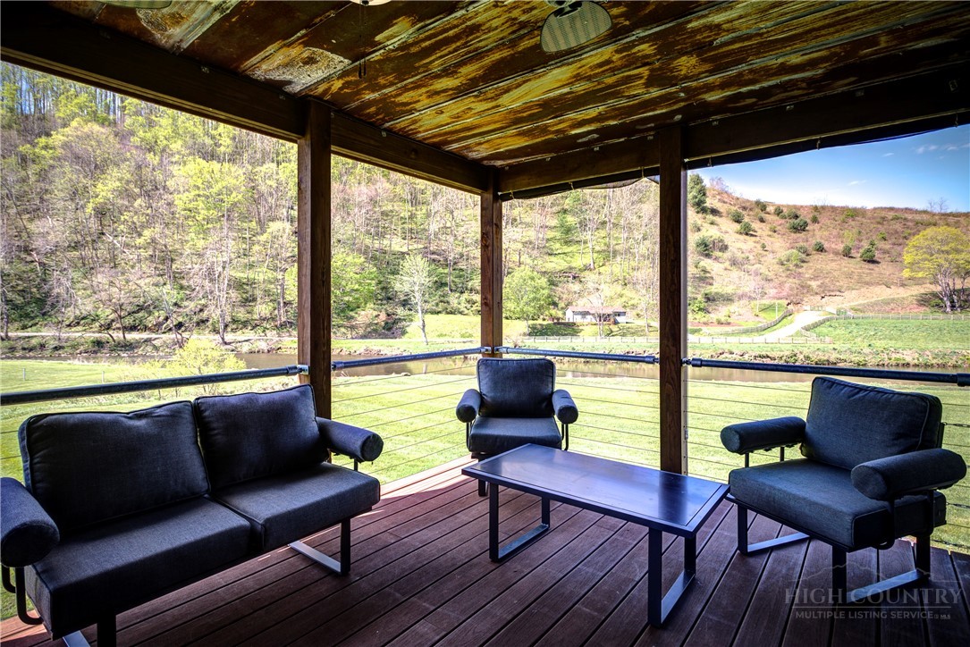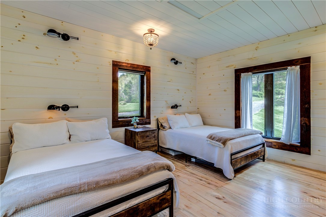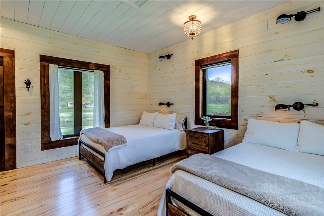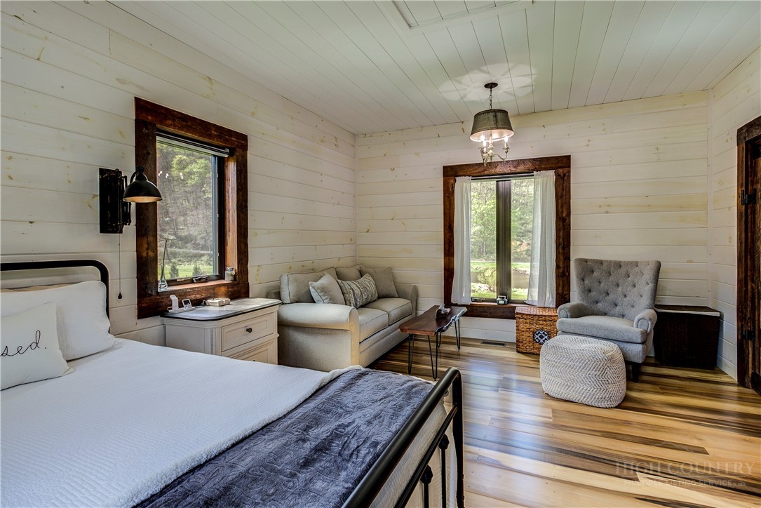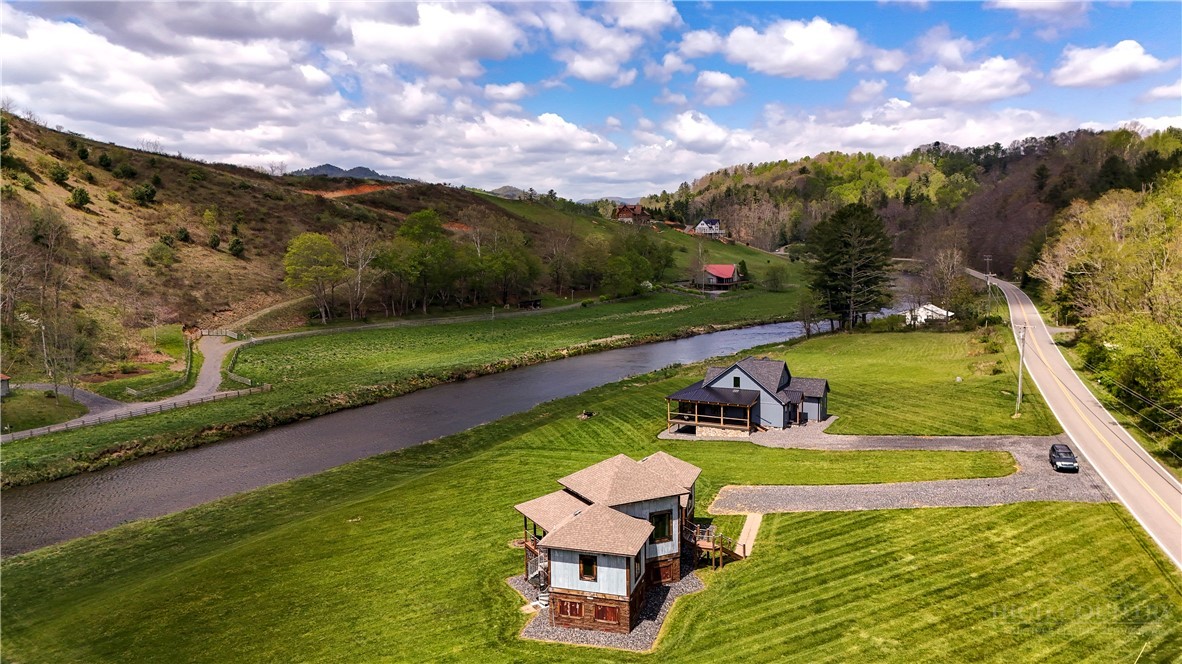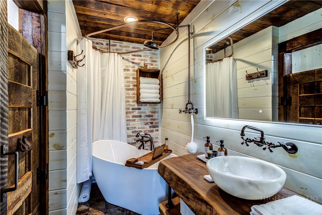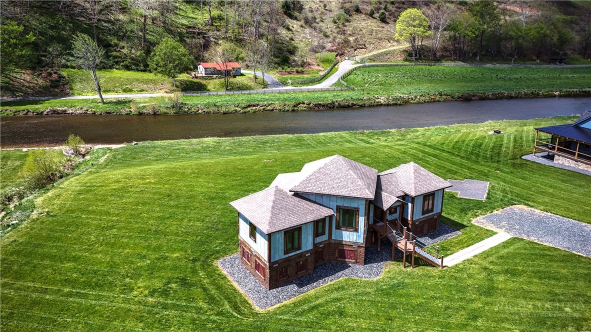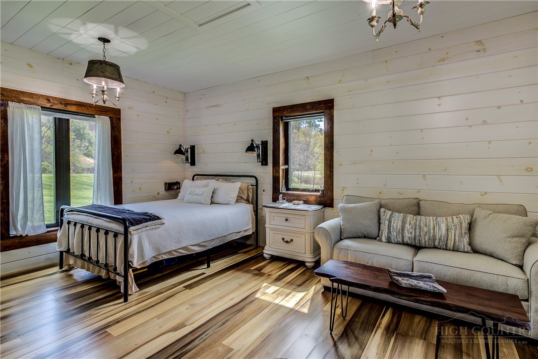 Unique, custom, thoughtfully designed and beautiful are just a few words to describe this riverfront home! Built in 2022, this home offers everything you could need. Step into your one-of-a-kind space where craftsmanship, history, and modern comfort all come together to offer effortless river living. The living room and kitchen feature soaring 14-foot ceilings, bedrooms offer 9-foot ceilings, and bathrooms and hallways have 8-foot ceilings for a cozy feel. Character shines throughout the entire home. Reclaimed Oak from an 1800s barn at Latta Place Plantation in Huntersville, NC enhances the living room walls, hallways, ceilings, fireplace surround, bathroom ceilings, and all window and door trim. The primary bedroom features Rainbow Poplar flooring and closet walls, while the second bedroom showcases Ambrosia Maple from a mill in Mountain City, TN. Living areas include handcrafted flooring of Oak, Hickory, Maple, Poplar, and Pine from Johnson City, TN, hand-stained in five tones that go with each species. Custom details include a protective door above the sliding glass door with hand crank, auto-lock, and brake. Interior doors, bathroom cabinetry, and towel storage were built by local craftsman Maurice Jenkins. Live-edge black walnut highlights bathroom countertops and shelving. The kitchen features custom cabinetry, Café appliances by GE, a custom island light made from an antique hay trolley, and a stove hood crafted from reclaimed wood and hand-hammered copper. Enjoy a Jotul 3 propane fireplace, tankless Rinnai water heater, soaker tub with shower, and tallboy toilets with UK-imported pull chains. The home is fully furnished with leather seating, a queen bed, pullout sofa, two double beds, and an LG washer/dryer tower. Exterior features include an electric/propane HVAC system with Nest control, a solid mahogany front door, Trex porches, aged galvanized metal porch ceilings, distressed galvanized siding and ample storage space. The property also offers a custom bridge over the creek, stone river steps, whole-house water filtration, a camper pad with 30-amp hookup and septic, and wiring for exterior security cameras. Enjoy relaxing on your covered porch or head down to the river and set your umbrellas in the designated spots on your flagstone patio. A rare blend of rustic heritage, artisan craftsmanship, and modern comfort—this meticulously designed retreat is truly special. Altogether, these features make this home a rare opportunity to own a thoughtfully crafted retreat where every detail has been carefully considered. Schedule your showing today!