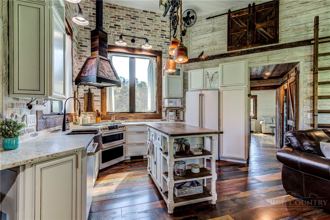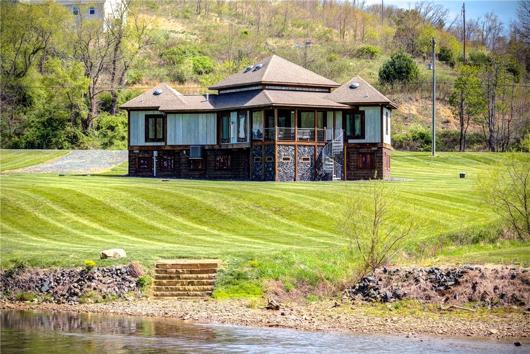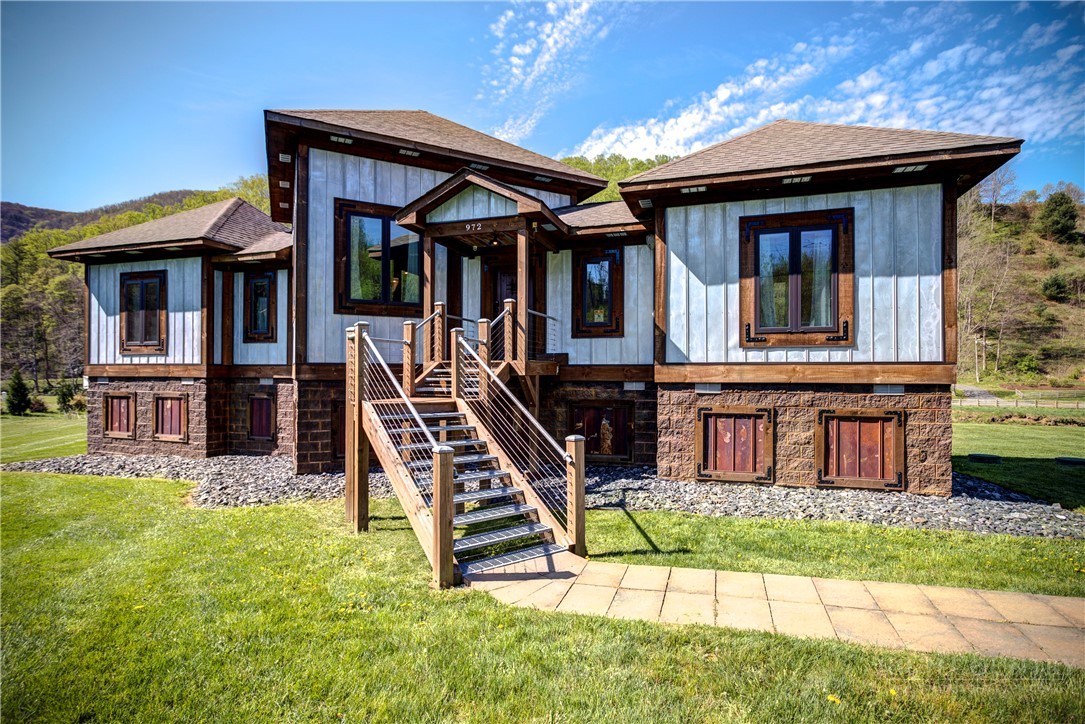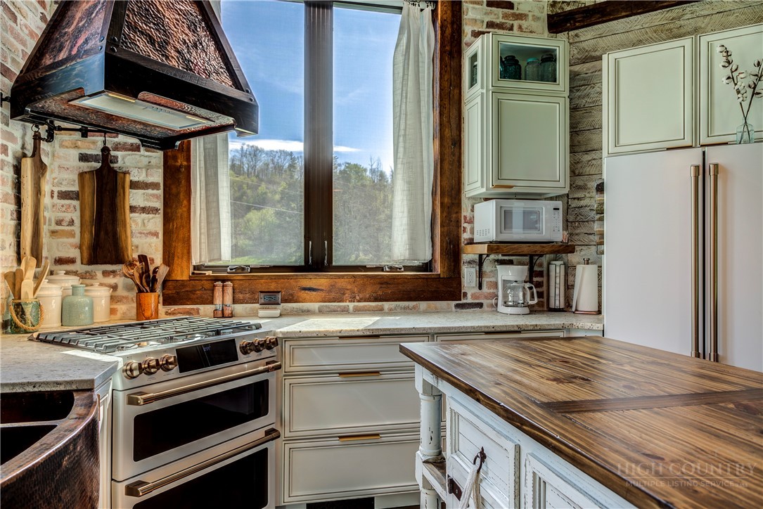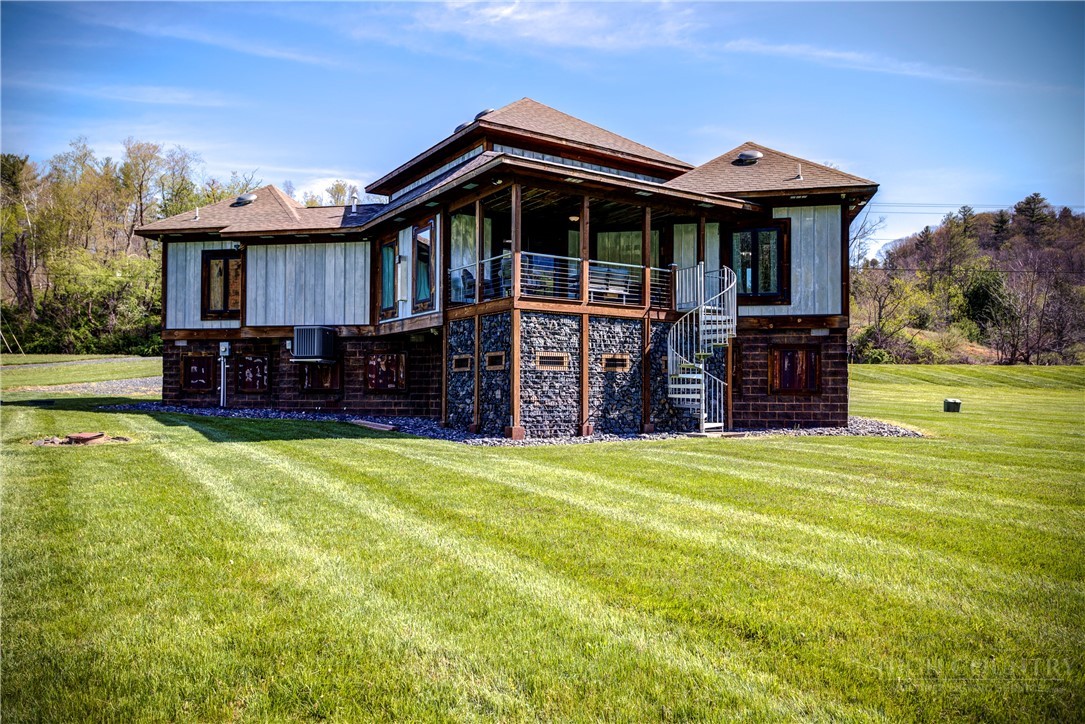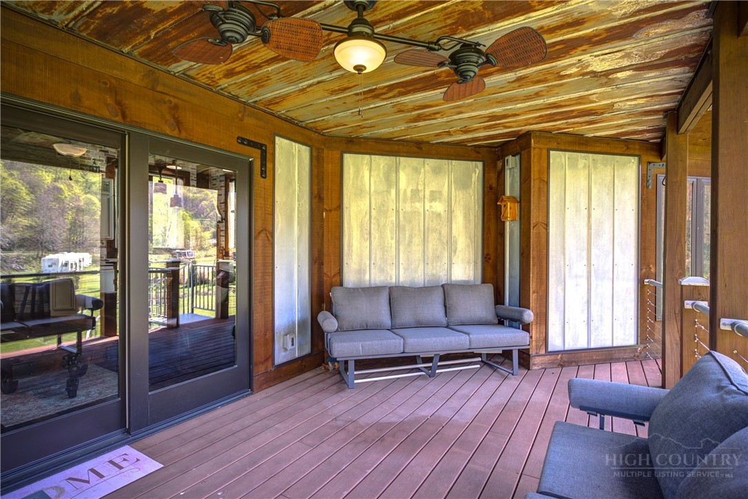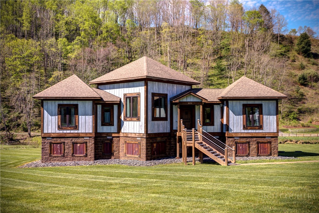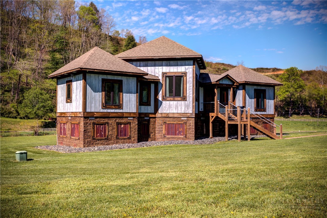Unique, custom, thoughtfully designed and beautiful are just a few words to describe this riverfront home! Built in 2022, this home offers everything you could need. Step into your one-of-a-kind space where craftsmanship, history, and modern comfort all come together to offer effortless river living. The living room and kitchen feature soaring 14-foot ceilings, bedrooms offer 9-foot ceilings, and bathrooms and hallways have 8-foot ceilings for a cozy feel. Character shines throughout the entire home. Reclaimed Oak from an 1800s barn at Latta Place Plantation in Huntersville, NC enhances the living room walls, hallways, ceilings, fireplace surround, bathroom ceilings, and all window and door trim. The primary bedroom features Rainbow Poplar flooring and closet walls, while the second bedroom showcases Ambrosia Maple from a mill in Mountain City, TN. Living areas include handcrafted flooring of Oak, Hickory, Maple, Poplar, and Pine from Johnson City, TN, hand-stained in five tones that go with each species. Custom details include a protective door above the sliding glass door with hand crank, auto-lock, and brake. Interior doors, bathroom cabinetry, and towel storage were built by local craftsman Maurice Jenkins. Live-edge black walnut highlights bathroom countertops and shelving. The kitchen features custom cabinetry, Café appliances by GE, a custom island light made from an antique hay trolley, and a stove hood crafted from reclaimed wood and hand-hammered copper. Enjoy a Jotul 3 propane fireplace, tankless Rinnai water heater, soaker tub with shower, and tallboy toilets with UK-imported pull chains. The home is fully furnished with leather seating, a queen bed, pullout sofa, two double beds, and an LG washer/dryer tower. Exterior features include an electric/propane HVAC system with Nest control, a solid mahogany front door, Trex porches, aged galvanized metal porch ceilings, distressed galvanized siding and ample storage space. The property also offers a custom bridge over the creek, stone river steps, whole-house water filtration, a camper pad with 30-amp hookup and septic, and wiring for exterior security cameras. Enjoy relaxing on your covered porch or head down to the river and set your umbrellas in the designated spots on your flagstone patio. A rare blend of rustic heritage, artisan craftsmanship, and modern comfort—this meticulously designed retreat is truly special. Altogether, these features make this home a rare opportunity to own a thoughtfully crafted retreat where every detail has been carefully considered. Schedule your showing today!