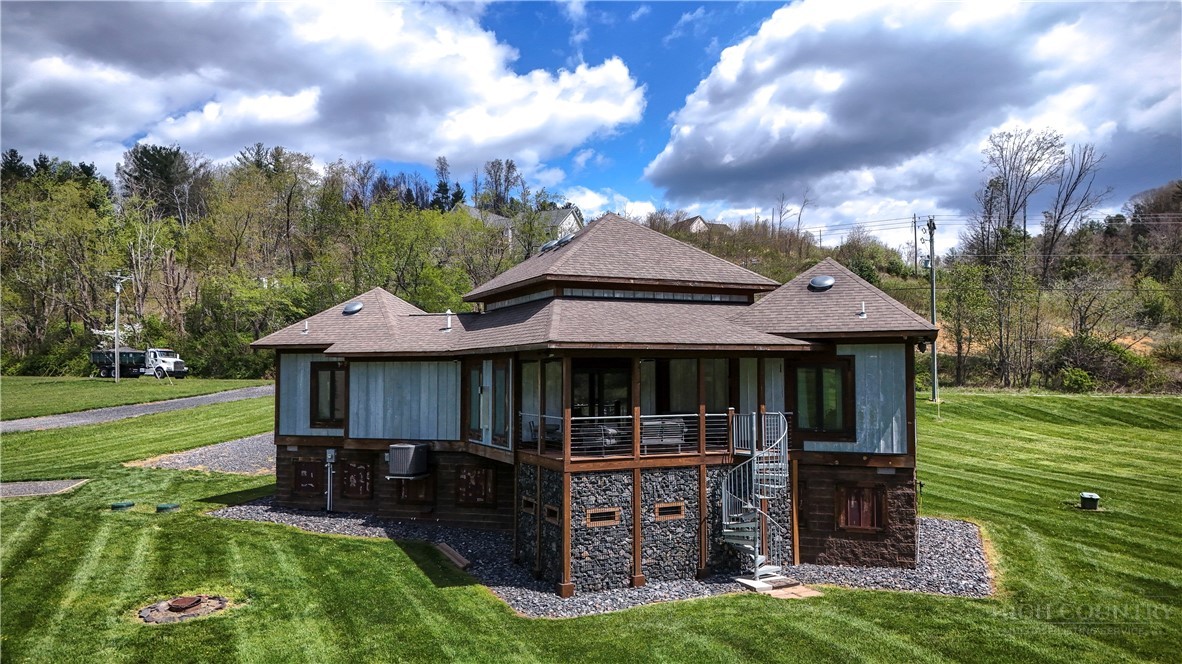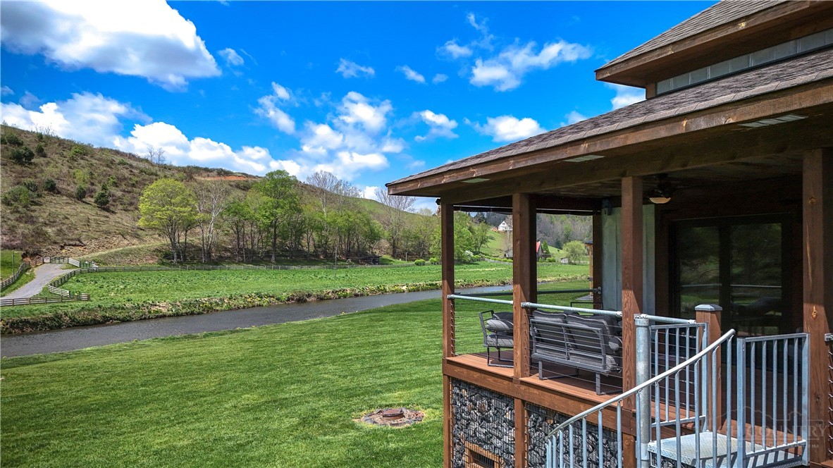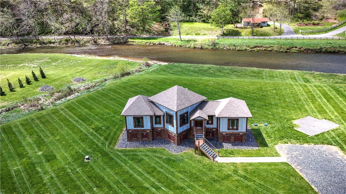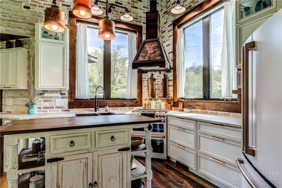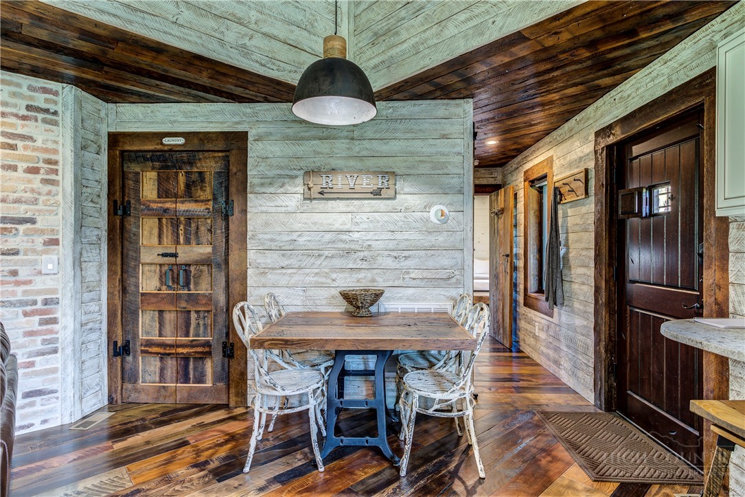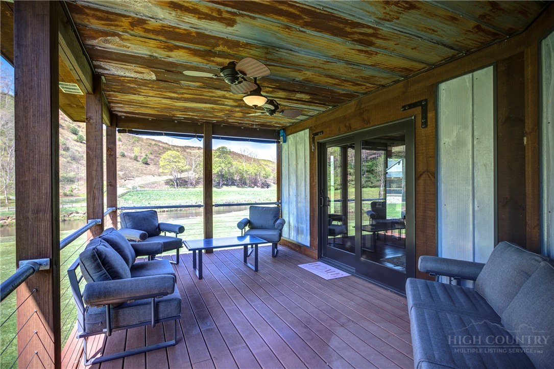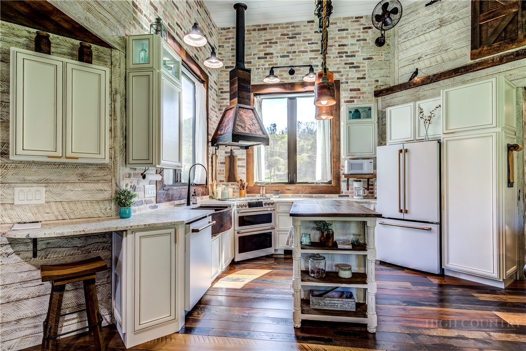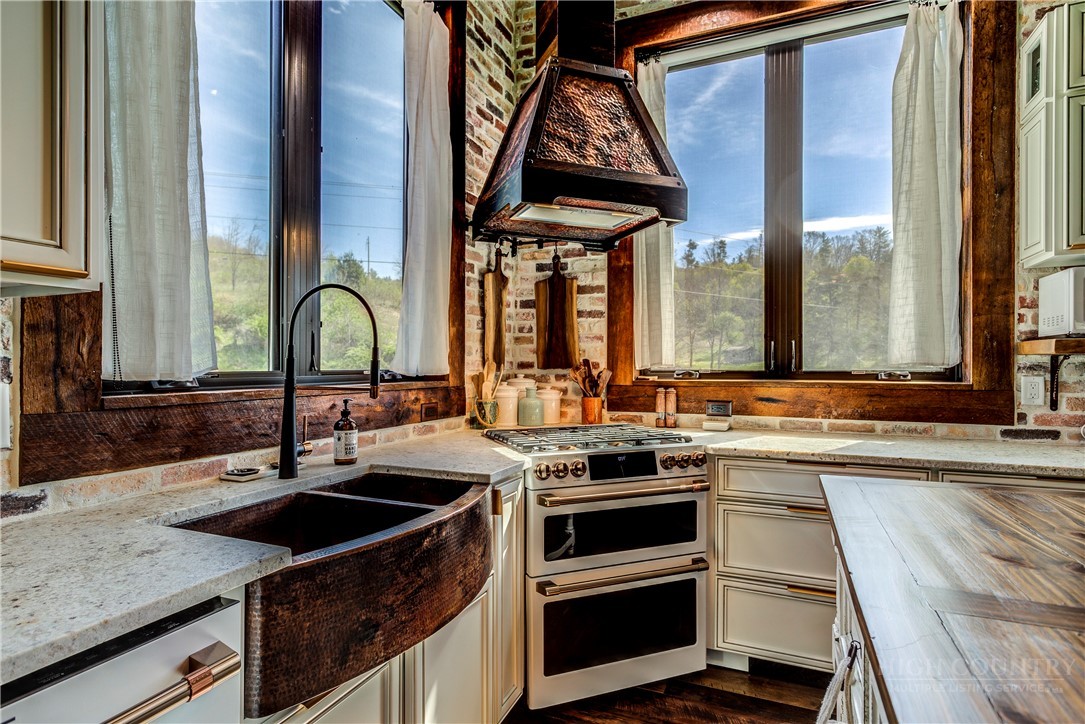 Unique, custom, thoughtfully designed and beautiful are just a few words to describe this riverfront home! Built in 2022, this home offers everything you could need. Step into your one-of-a-kind space where craftsmanship, history, and modern comfort all come together to offer effortless river living. The living room and kitchen feature soaring 14-foot ceilings, bedrooms offer 9-foot ceilings, and bathrooms and hallways have 8-foot ceilings for a cozy feel. Character shines throughout the entire home. Reclaimed Oak from an 1800s barn at Latta Place Plantation in Huntersville, NC enhances the living room walls, hallways, ceilings, fireplace surround, bathroom ceilings, and all window and door trim. The primary bedroom features Rainbow Poplar flooring and closet walls, while the second bedroom showcases Ambrosia Maple from a mill in Mountain City, TN. Living areas include handcrafted flooring of Oak, Hickory, Maple, Poplar, and Pine from Johnson City, TN, hand-stained in five tones that go with each species. Custom details include a protective door above the sliding glass door with hand crank, auto-lock, and brake. Interior doors, bathroom cabinetry, and towel storage were built by local craftsman Maurice Jenkins. Live-edge black walnut highlights bathroom countertops and shelving. The kitchen features custom cabinetry, Café appliances by GE, a custom island light made from an antique hay trolley, and a stove hood crafted from reclaimed wood and hand-hammered copper. Enjoy a Jotul 3 propane fireplace, tankless Rinnai water heater, soaker tub with shower, and tallboy toilets with UK-imported pull chains. The home is fully furnished with leather seating, a queen bed, pullout sofa, two double beds, and an LG washer/dryer tower. Exterior features include an electric/propane HVAC system with Nest control, a solid mahogany front door, Trex porches, aged galvanized metal porch ceilings, distressed galvanized siding and ample storage space. The property also offers a custom bridge over the creek, stone river steps, whole-house water filtration, a camper pad with 30-amp hookup and septic, and wiring for exterior security cameras. Enjoy relaxing on your covered porch or head down to the river and set your umbrellas in the designated spots on your flagstone patio. A rare blend of rustic heritage, artisan craftsmanship, and modern comfort—this meticulously designed retreat is truly special. Altogether, these features make this home a rare opportunity to own a thoughtfully crafted retreat where every detail has been carefully considered. Schedule your showing today!
