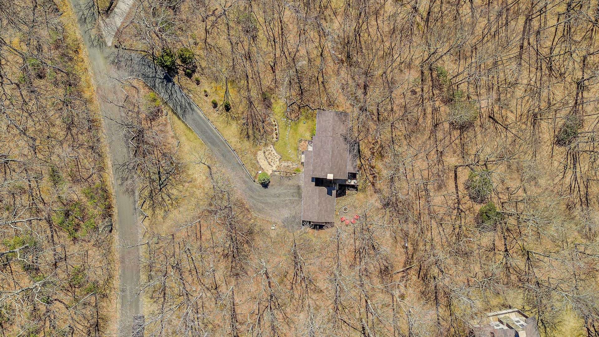 Private driveway leads down to the cabin set against a backdrop of serene natural beauty and a noisy mountain stream.