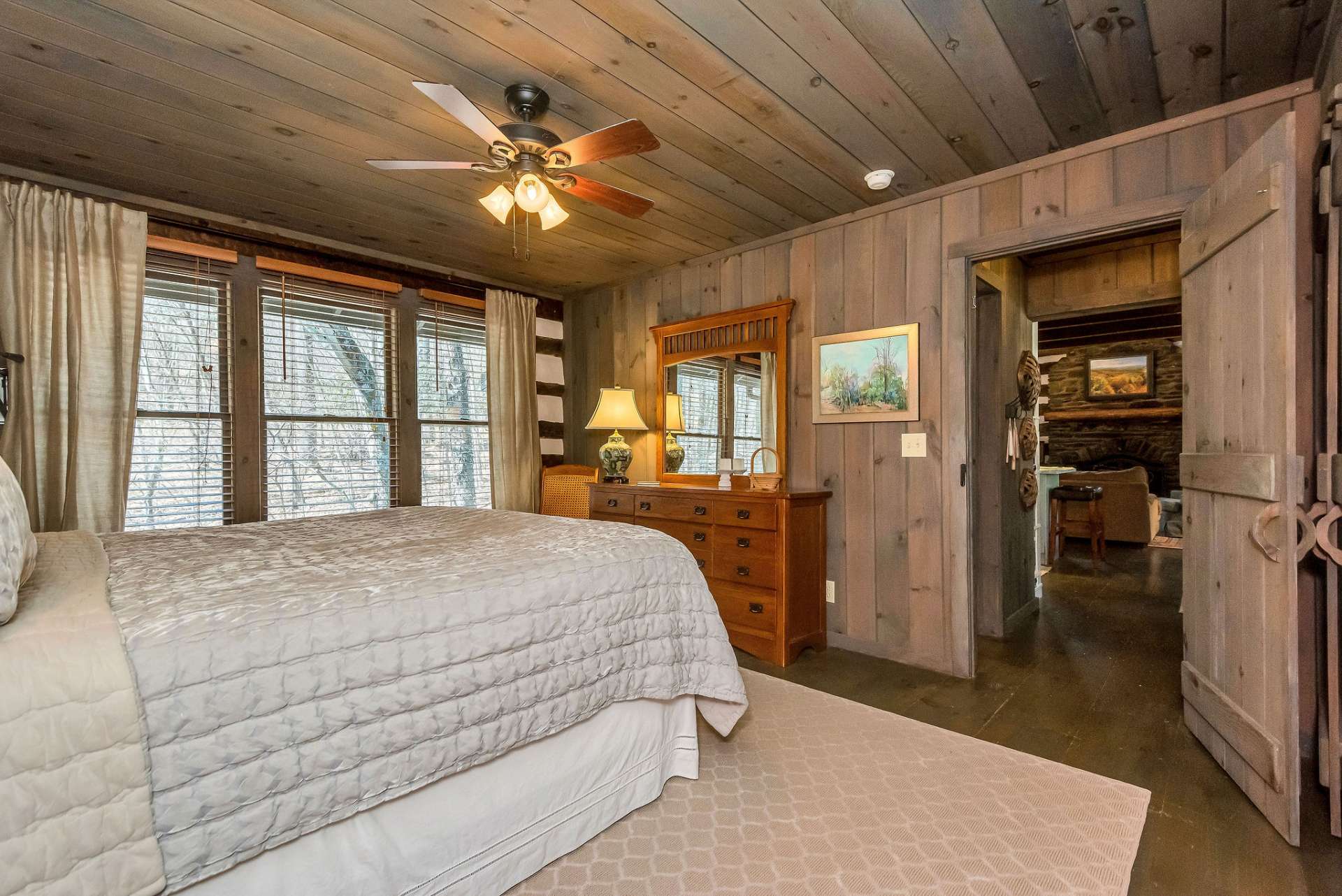 Designed with rustic charm and comfort in mind, the primary bedroom features warm wood, cozy furnishings, and soft textiles that create a welcoming and inviting atmosphere.