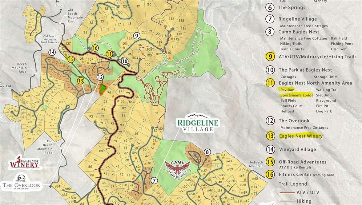 Incredible lot O-15 located in The Overlook section of The Lodges at Eagles Nest. These village cottages make great weekend homes in Eagles Nest or rental investments. This lot is located just 680 feet from the winery and is next to the North Pavilion Sportsman’s Lodge, you will be steps away from all of the action within the community from the winery, to all of the sports fields, hiking, biking, horse, and ATV trails, as well as their new fitness facility. Also, conveniently located next to three back gates of Eagles Nest you will be just a few minutes from Beech Mountain Ski Resort for all of your top winter and summer activities outside of the gates. For a full list of amenities you can search for The Lodges at Eagles Nest Banner Elk. Since these lots do not have a physical address you can search for the coordinates of 36.209756, -81.920812. This lot has a water water well.