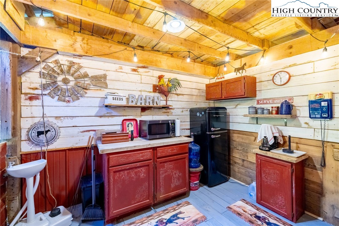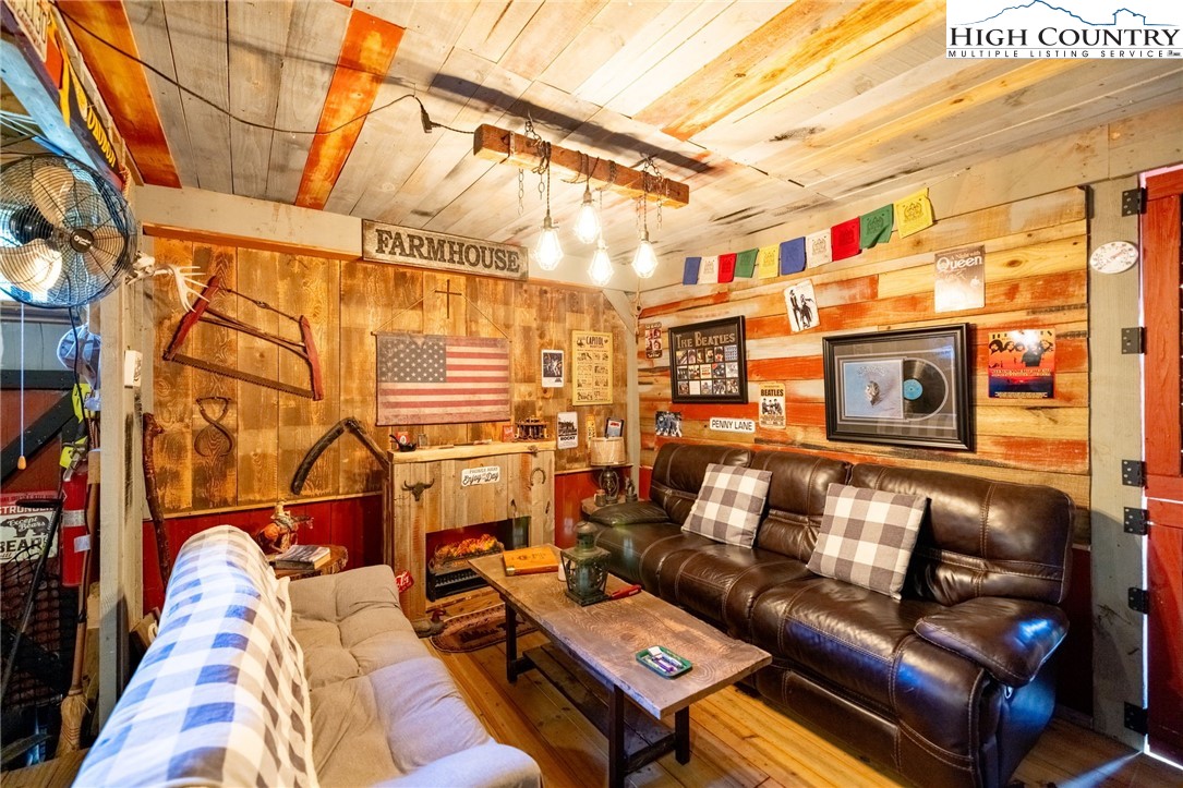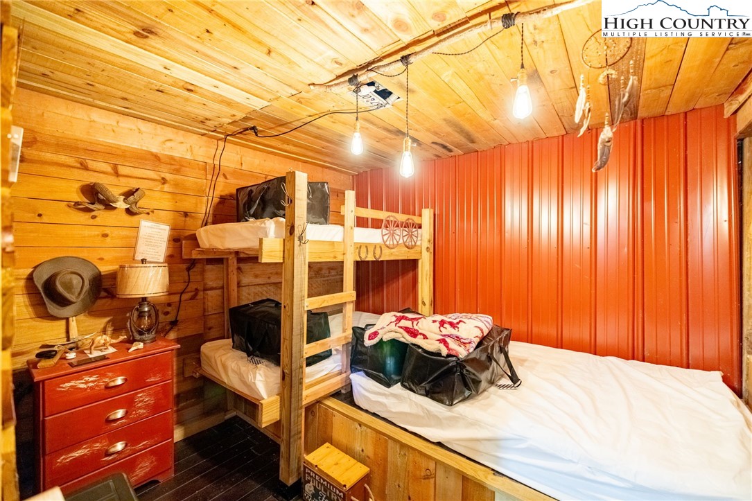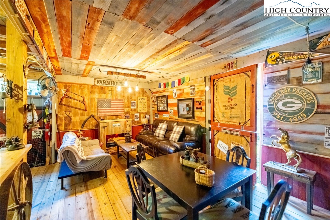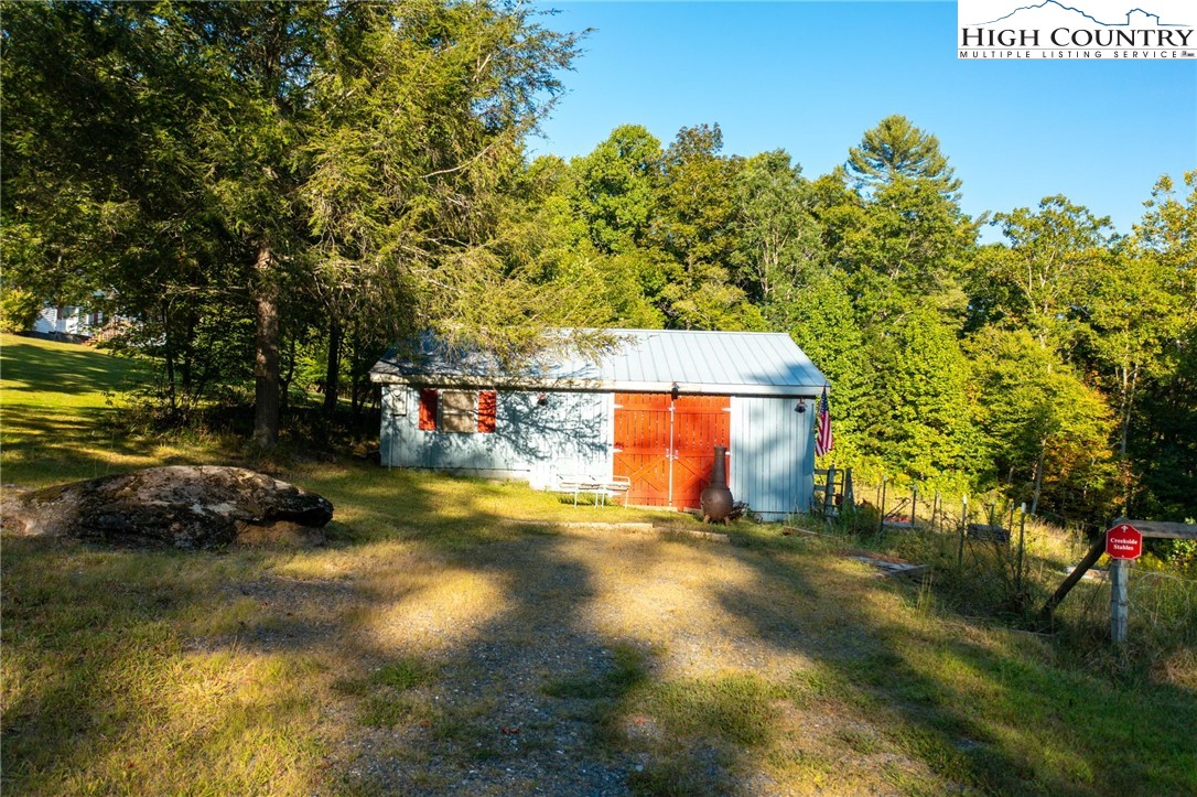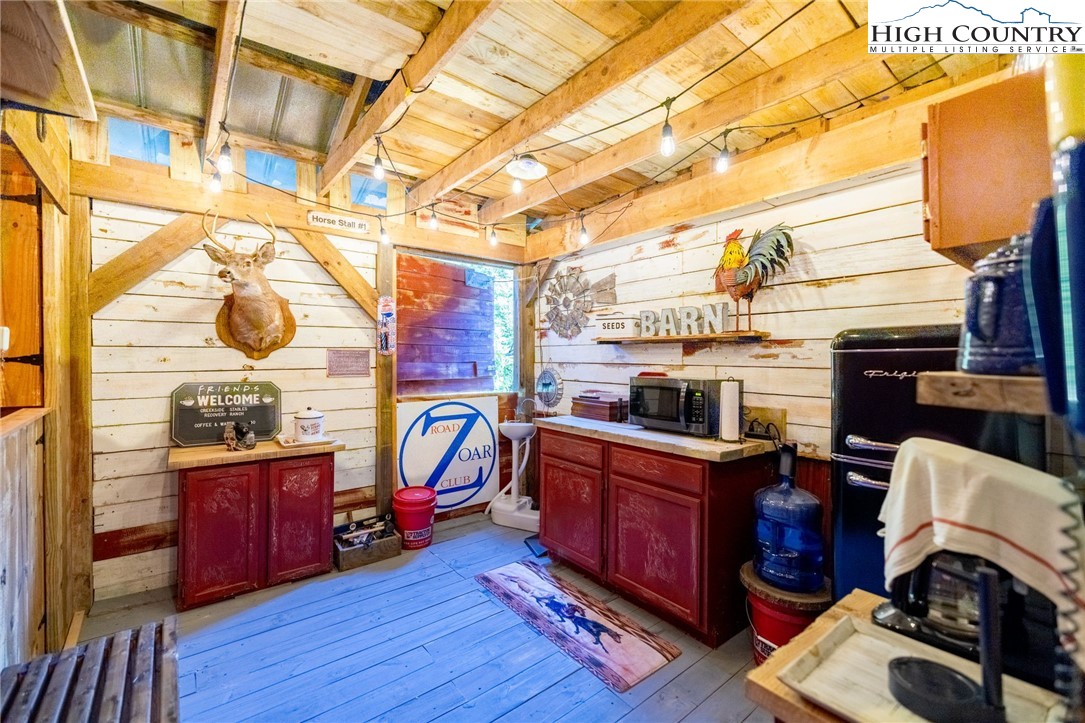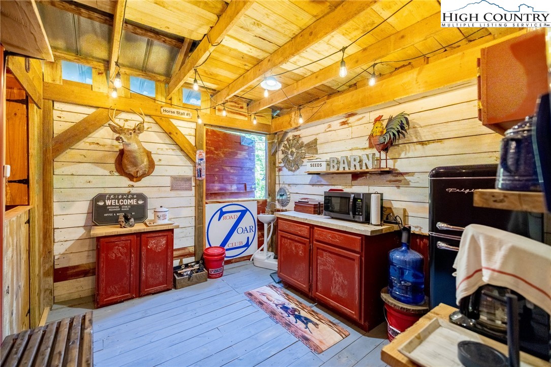 Fully Furnished, Nestled on 2.25 acres of serene land, Creekside Stables offers the perfect blend of relaxation and adventure. Would make a great retreat center, church camp, or airbnd. With a charming creek and pond, this unique property features a converted barn, now a cozy barndominium that comfortably sleeps 8-11 guests. The interior showcases rustic wood and tin finishes, providing a warm, inviting atmosphere, complemented by three electric heaters, including an electric fireplace. The living space includes two dedicated sleeping areas, a comfortable lounge, and an open kitchen and dining space. While there’s no well or septic system installed, the property includes an onsite water storage tank and dispensers, along with a portable commode in a designated bathroom area for convenience. The acreage is ideal for equestrian enthusiasts or a small mini-farm, with fencing on both sides of the road. Located just 10-15 minutes from Jefferson and West Jefferson, and a quick 5-minute drive to Lansing and the New River, this retreat combines rural tranquility with easy access to nearby towns. All of the furniture conveys and and most décor and furnishings remain including 2 refrigerators, 1 mircowave and 1 pizza oven making it ready for you to enjoy!